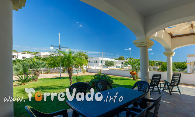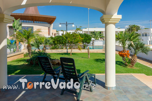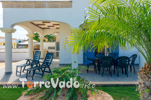 Il vero protagonista è l’esterno: un ampio porticato attrezzato ideale per colazioni lente, cene all’aperto e relax dopo mare, affacciato su giardino con prato verde, palme e piante ornamentali.
